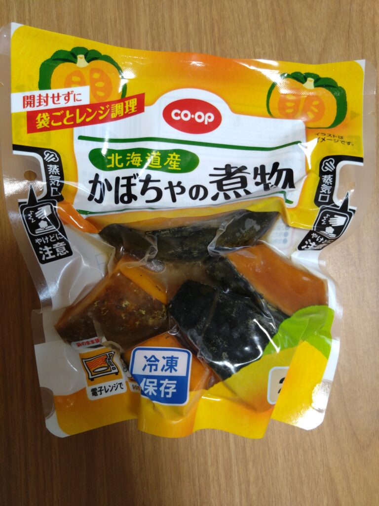 この商品は冷凍状態で届き食べたい時に袋のまま電子レンジで温めるという商品です。大きめにカットされたかぼちゃの煮物がゴロッと5〜6個入っていて、味がよく染み込んでしっとりとした食感で美味しいです。2歳の子どももこの商品が大好きでお皿に盛ってあると「かぼちゃ💕」と言って真っ先に食べます。かぼちゃと言えるようになったのはこの商品がきっかけです(笑) ただ皮が硬い時があるので子どもが食べる分は皮を取り除いています。自分でかぼちゃの煮物を作ろうと思うと、硬いかぼちゃを切って調味料を計って落とし蓋してコンロに張り付いて…とかなり手間なので、これが冷凍庫にあるとあと1品野菜が欲しいという時にすごく重宝しています。